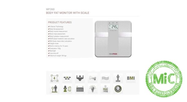 ترازو دیجیتال رزمکس مدل WF260 دارای قابلیت تعیین شاخص توده ی بدنی و چربی و حداکثر وزن قابلاندازهگیری 180 کیلوگرم است. برای اندازهگیری شاخصهای بدنی باید سن، قد و جنسیت را برای ترازو تعریف کرد. شاخصهایی که توسط ترازو محاسبه میشوند، شامل درصد چربی، درصد ماهیچه، وزن استخوانها، درصد آب بدن، میزان کالری موردنیاز روزانه (BMR) و شاخص تودهی بدنی (BMI) هستند. مقدار چربی بهعنوان درصدی از وزن کل بدن نمایش داده میشود. شاخص تودهی بدنی که با توجه به قد و وزن شخص محاسبه میشود، معیاری برای تعیین وزن مناسب برای هر شخص است. برای اندازهگیری وزن کافی است که با پا به سطح ترازو ضربه بزنید تا روشن شود. دقت اندازهگیری ترازو 100 گرم است و این یعنی تغییرات وزن کمتر از این مقدار را نمایش نمیدهد. با ایستادن روی دو قطعه فلز روی ترازو پس از چند ثانیه، عدد وزن ثابت شده و روی صفحه نمایش داده میشود. پسازآن ترازو شروع به آنالیز اطلاعات میکند و سپس در نیمهی پایینی صفحهنمایش، دو شاخص تودهی بدنی و درصد چربی بدن را نمایش میدهد و پس از چند ثانیه، ترازو به شکل خودکار خاموش میشود. اطلاعات اندازهگیریشده داخل حافظهی دستگاه ذخیره میشوند. ازآنجاییکه ممکن است افراد مختلف از ترازو استفاده کنند، حافظههایی جداگانه برای 10 شخص مختلف در نظر گرفته شده است. انرژی ترازو از سه عدد باتری نیمقلمی تأمین میشود که در پشت آن جای میگیرد. ترازو دیجیتال رزمکس مدل WF260 قابلیت نمایش وزن با واحدهای کیلوگرم، پوند و استون را دارد. برای تغییر واحد نمایش باید از دکمهای استفاده کرد که پشت ترازو قرار دارد. این ترازو دارای سطحی شیشهای با دو قطعه الکترود فلزی در کنارههاست که برای اندازهگیری شاخصهای بدنی استفاده میشود. چهار سنسور زیر پایههای ترازو قرار دارد که وظیفهی اندازهگیری وزن را بر عهده دارند. بهطور خلاصه ترازو دیجیتال رزمکس مدل WF260 دارای قابلیت اندازهگیری وزن تا 180 کیلوگرم، قابلیت محاسبهی انواع شاخصهای بدنی، دقت اندازهگیری 100 گرم، منبع انرژی باتری سکهای، حافظهی ذخیرهسازی برای 10 نفر، قابلیت تغییر واحد نمایش وزن و منبع انرژی باتری نیمقلم است.